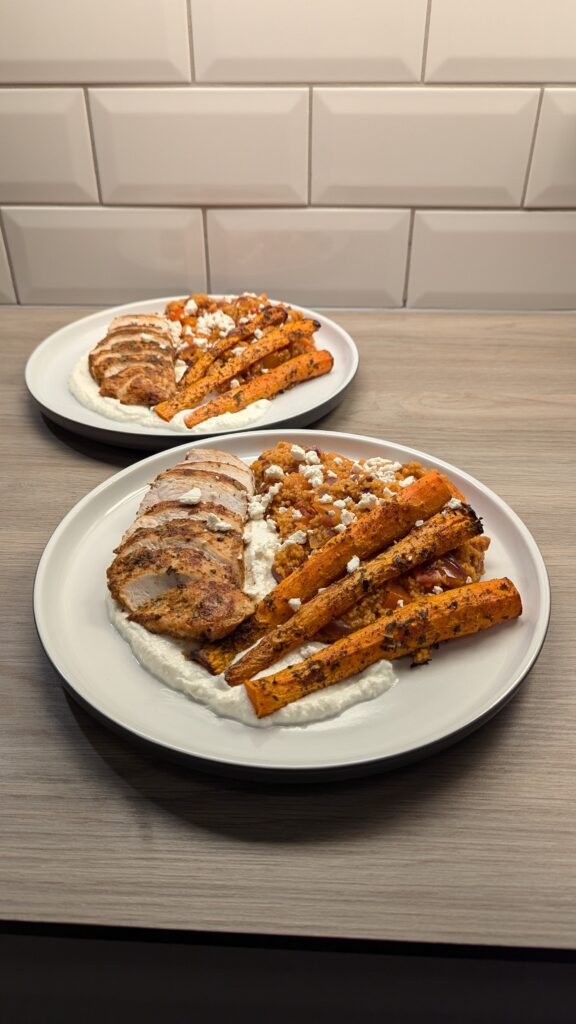 Harissa Chicken, Vegetable Cous Cous and Sumac Carrots with Whipped Feta