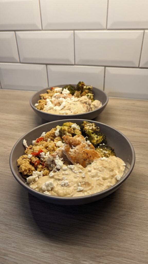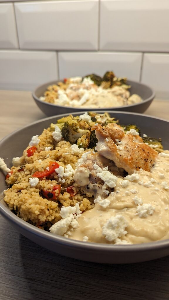 Pan Fried Chicken Thighs, Red Pepper Cous Cous with a Cream Sauce Topped with Feta!