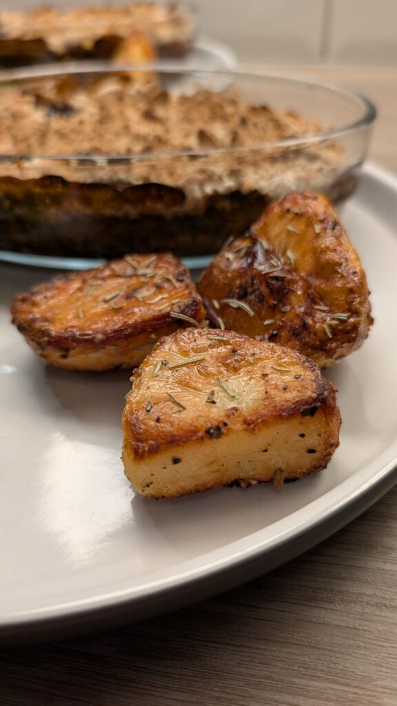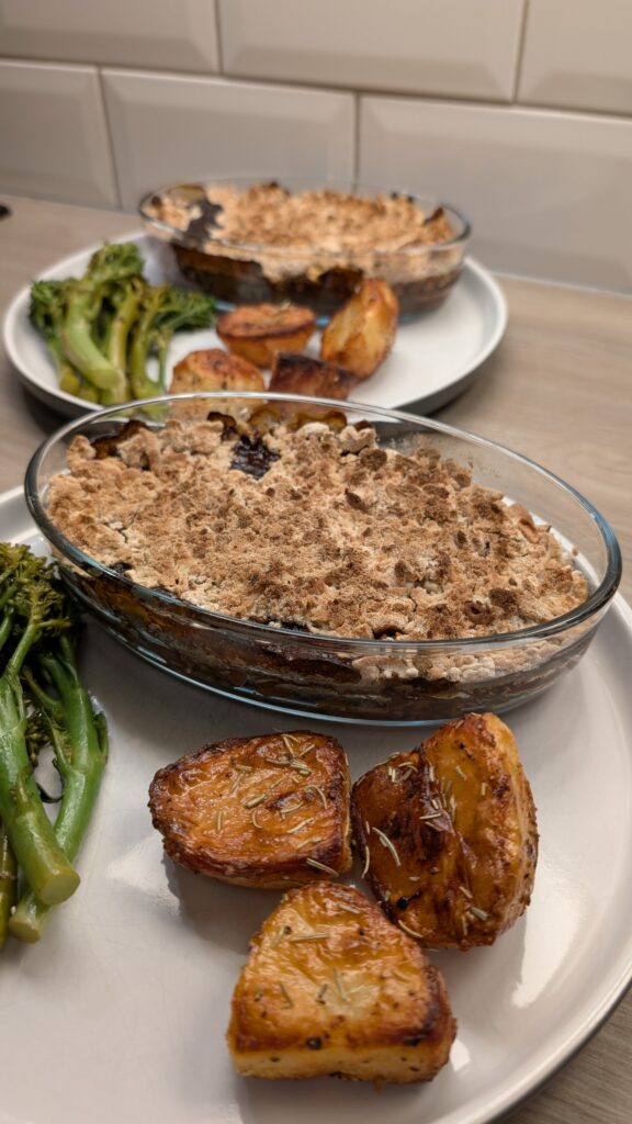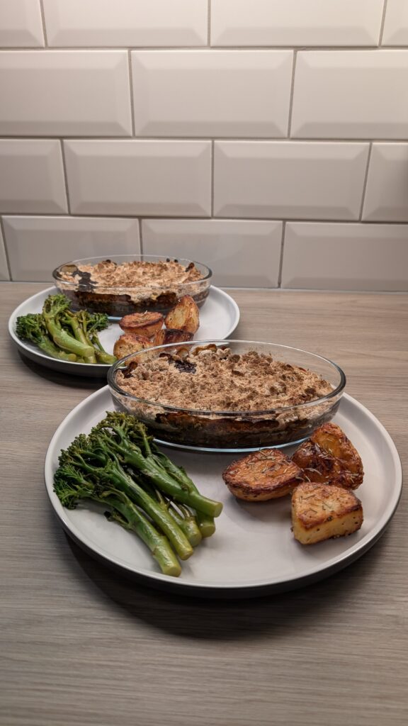 Beef ‘Crumble’, Rosemary Roast Potatoes and Balsamic Tenderstem Broccoli