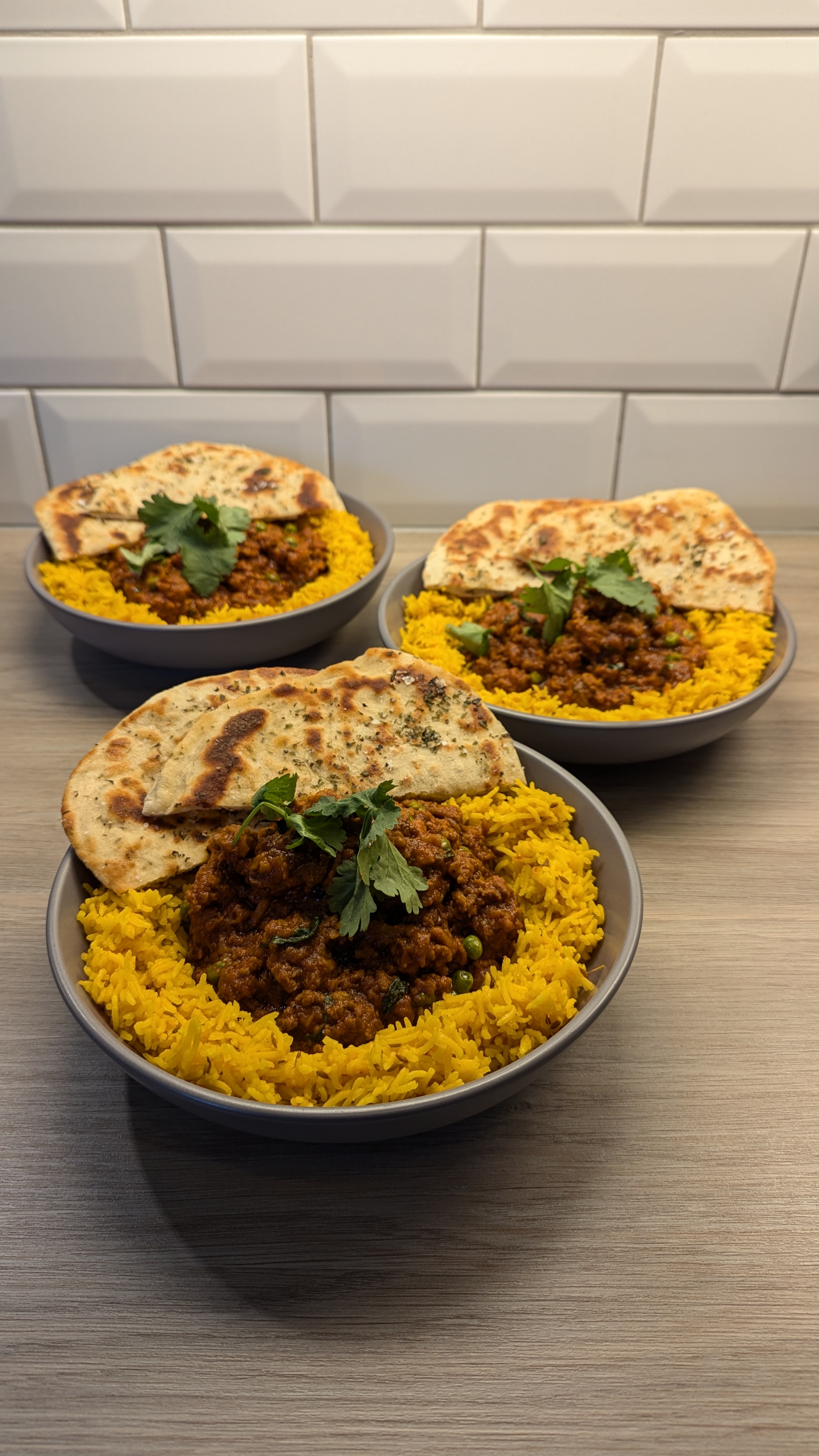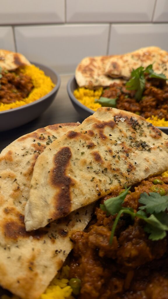 Beef Keema and Cumin Rice with Garlic and Coriander Flatbread