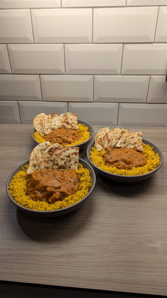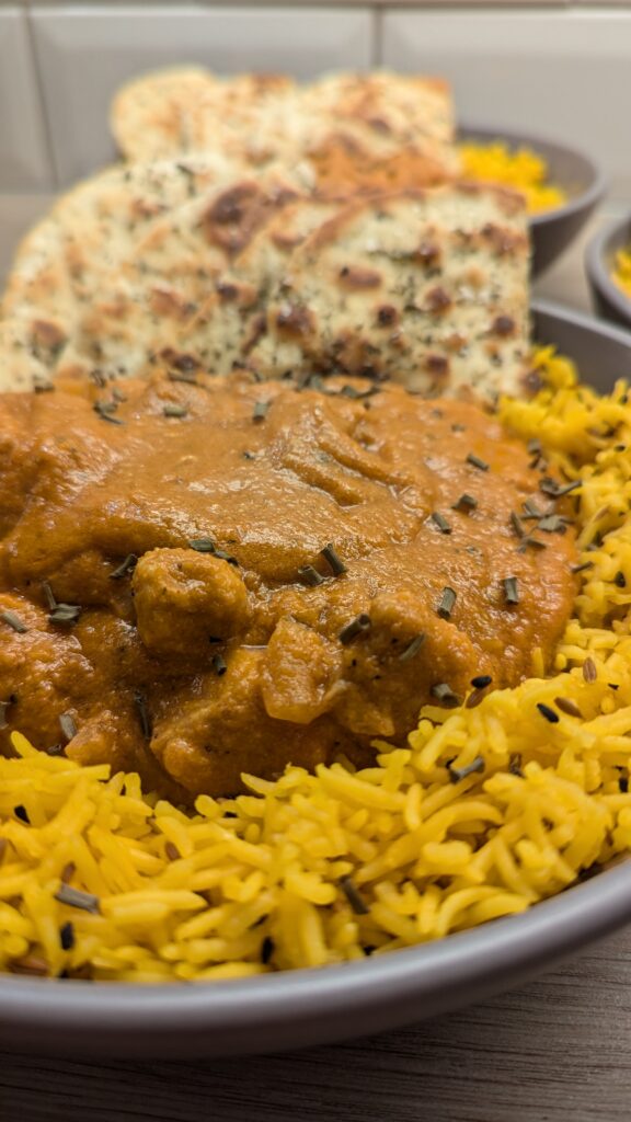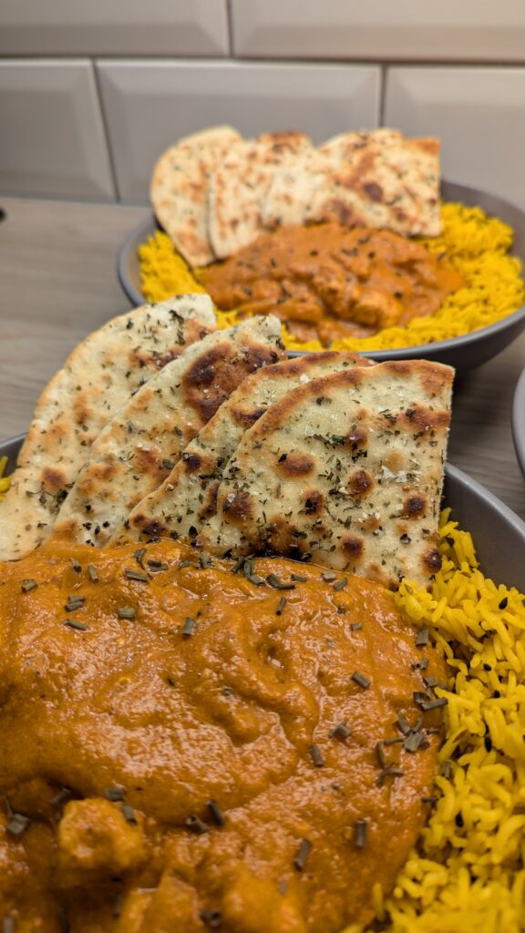 Chicken Tikka Masala and Pilau Rice with Garlic and Coriander Flatbreads