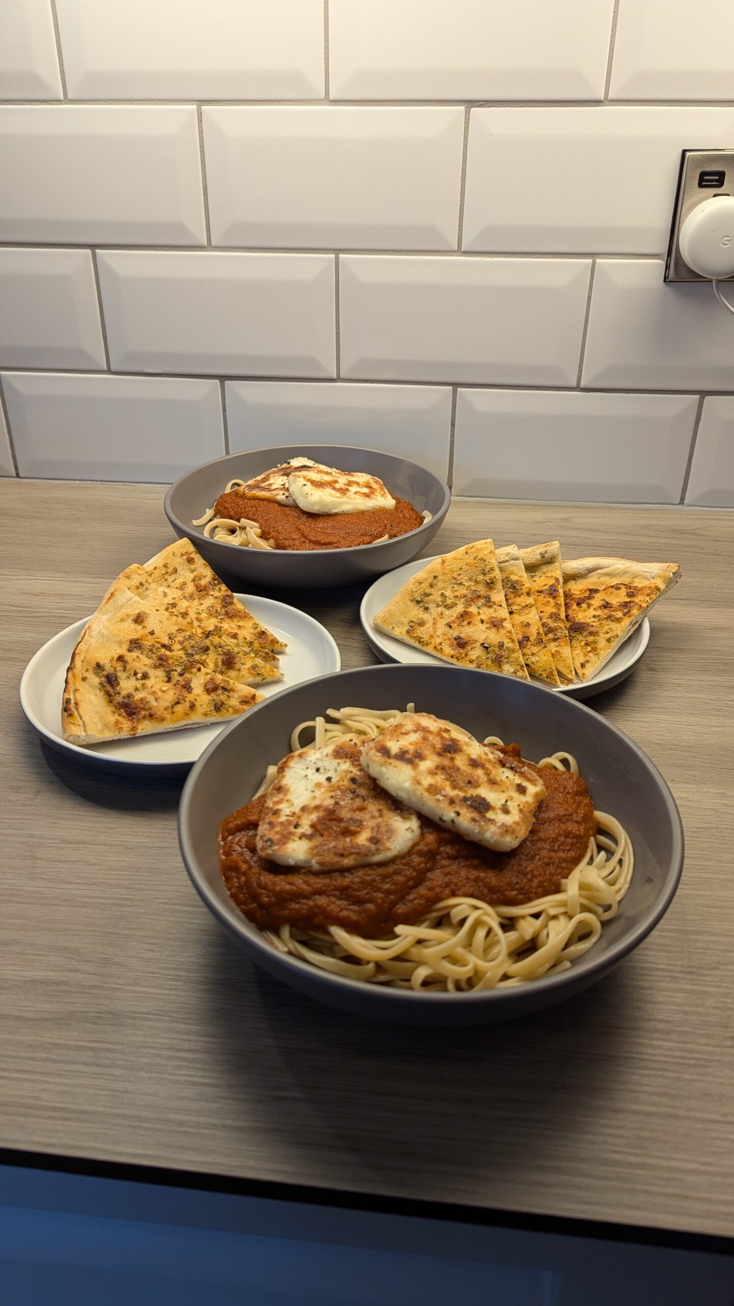 Crispy Halloumi, Smokey Red Pepper Linguine and Garlic Bread Pizza