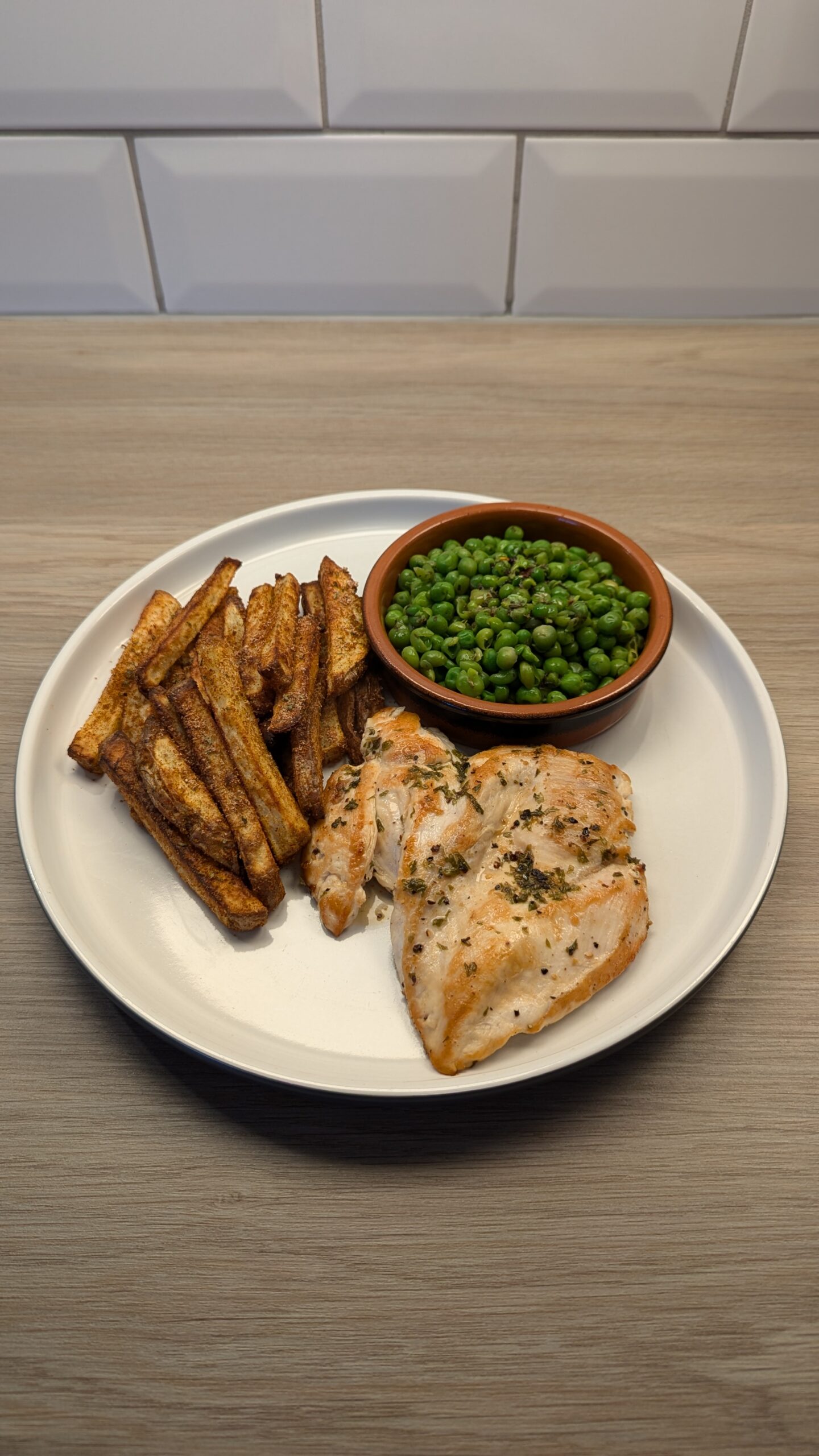 Lemon and Parsley Butterfly Chicken, Peri-Peri Friesand Macho Peas!