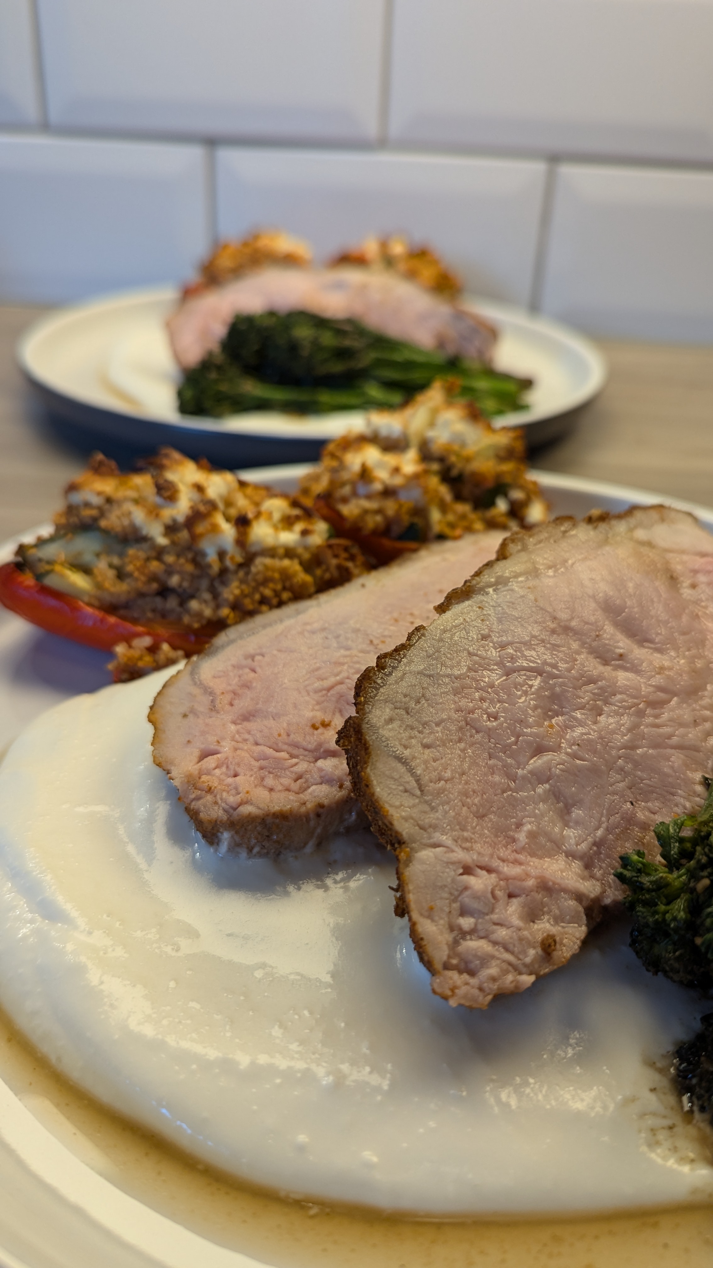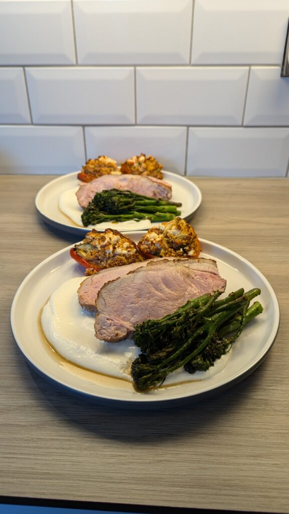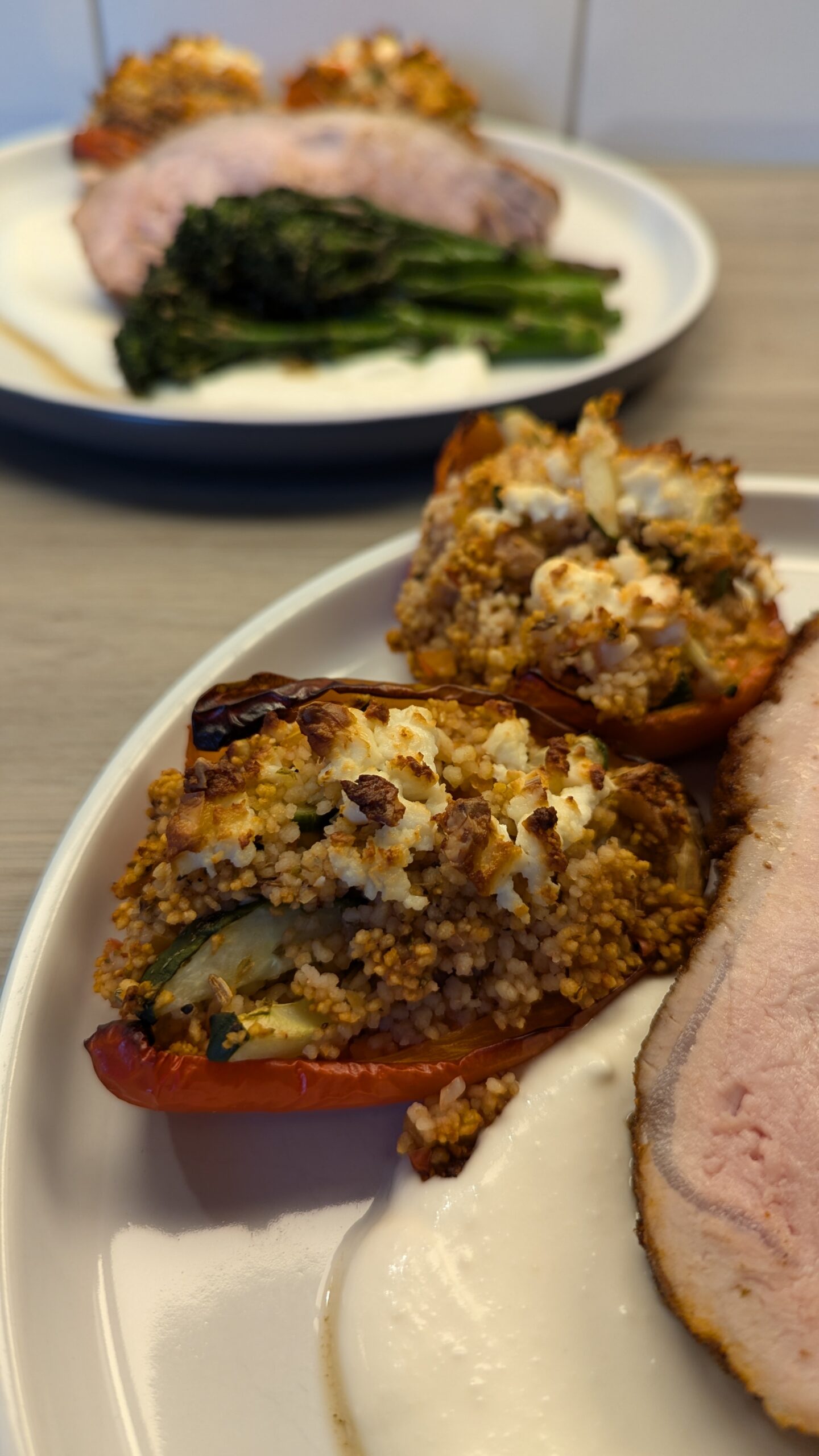 Harissa and Lime Pork Loin, Stuffed Peppers, Za’atar Tenderstem Broccoli and Whipped Feta