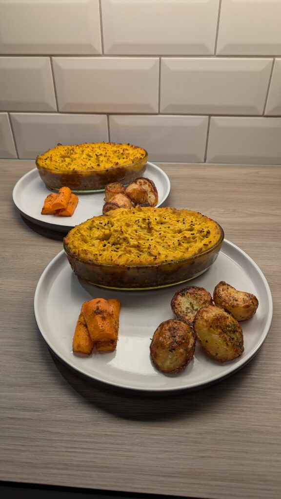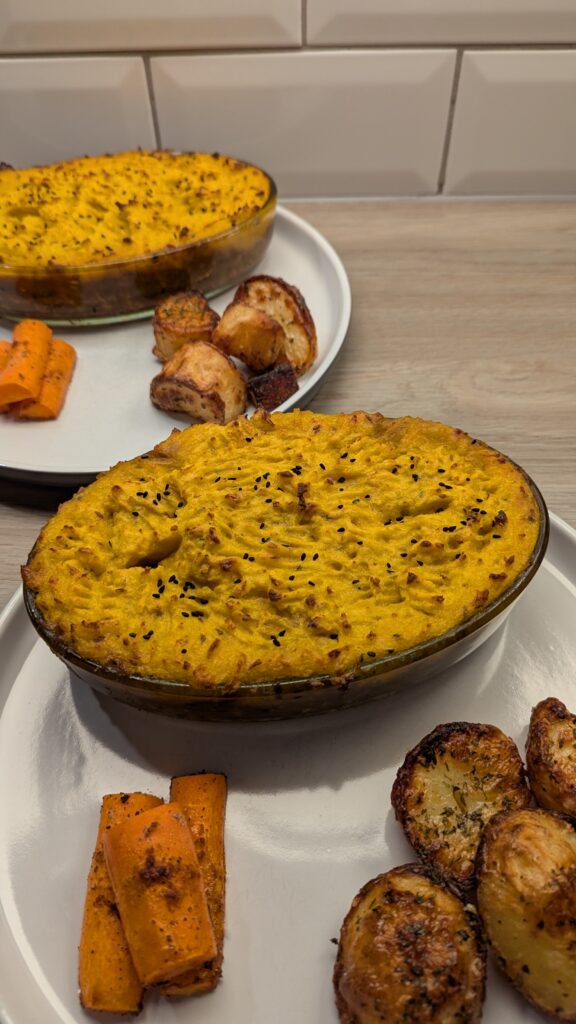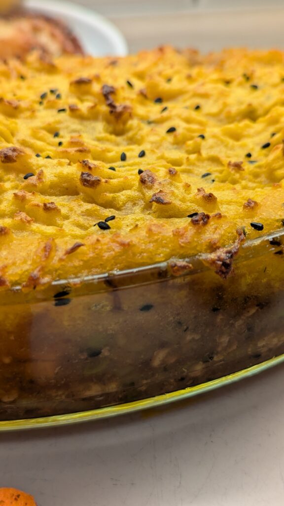 Indian Spiced Shepard’s Pie, Coriander Roast Potatoes and Ginger Carrots