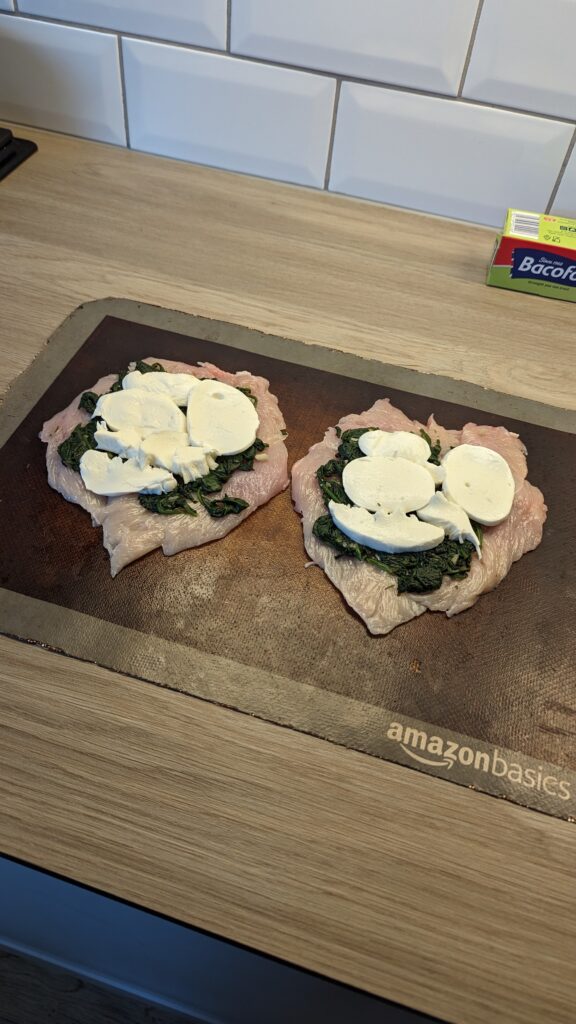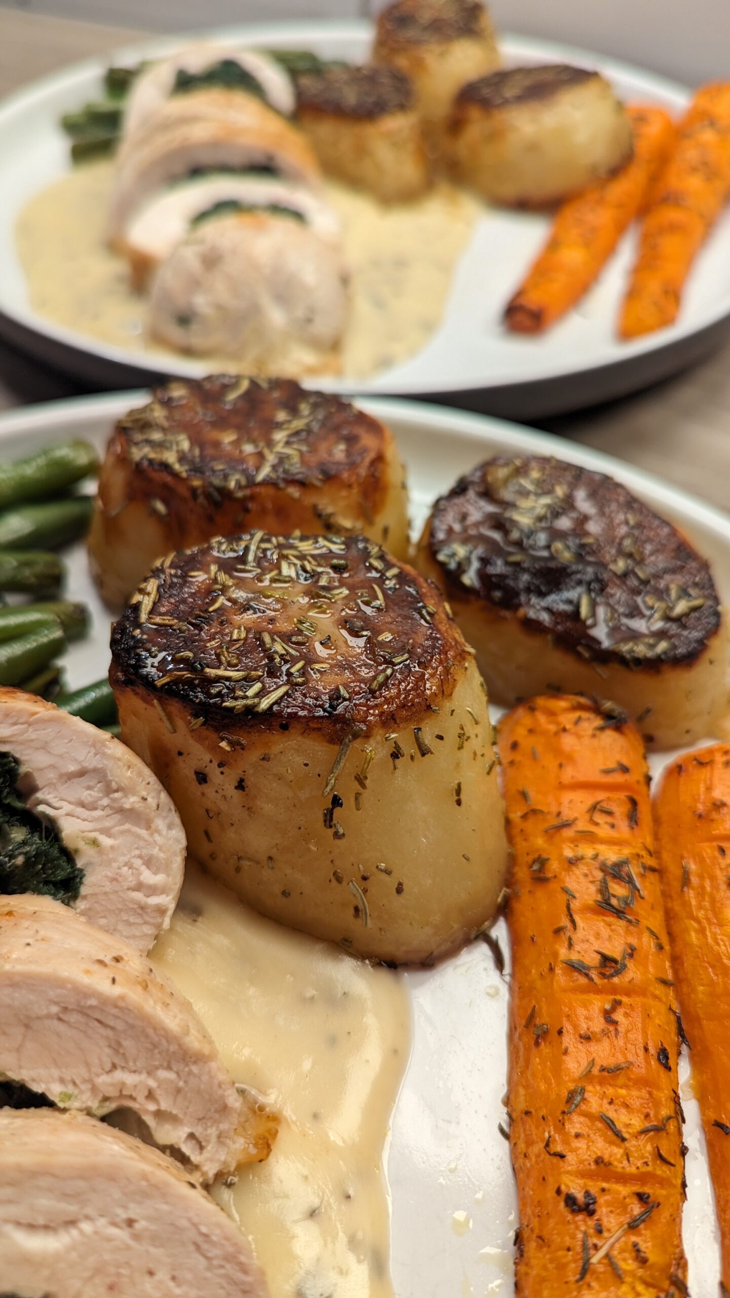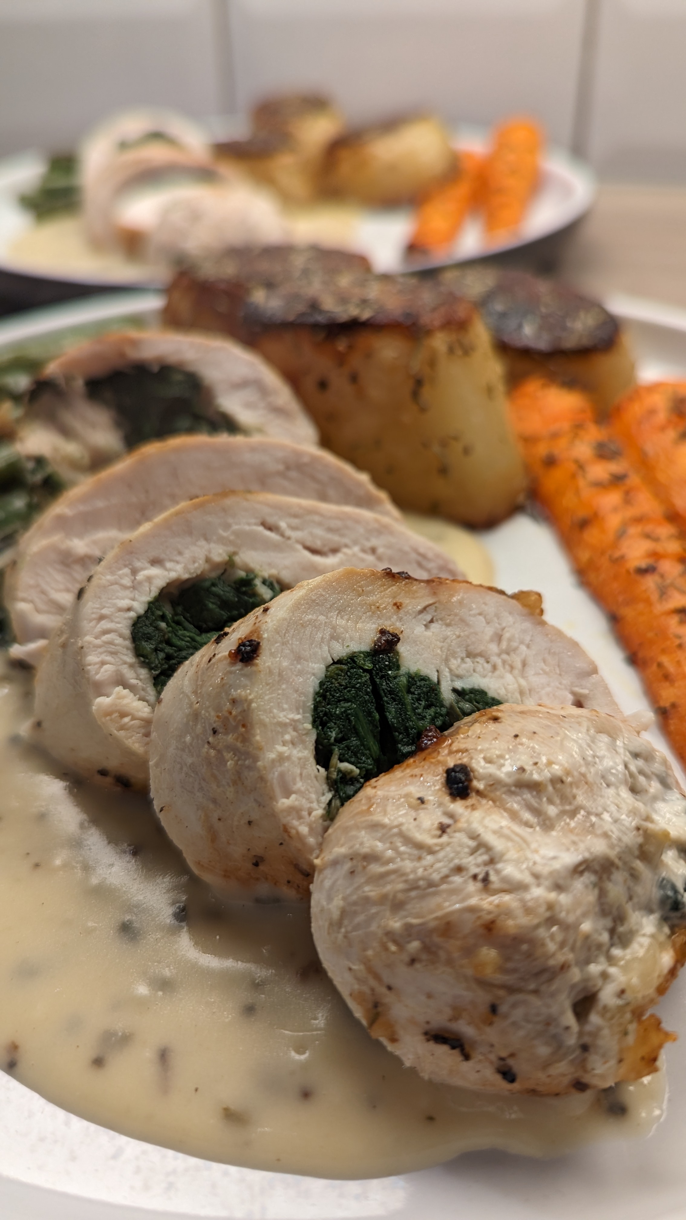 Mozzarella, Spinach and Tarragon Chicken Roulade, Fondant Potatoes, Garlic Green Beans and Roasted Carrots with a Lemon and Sage Sauce