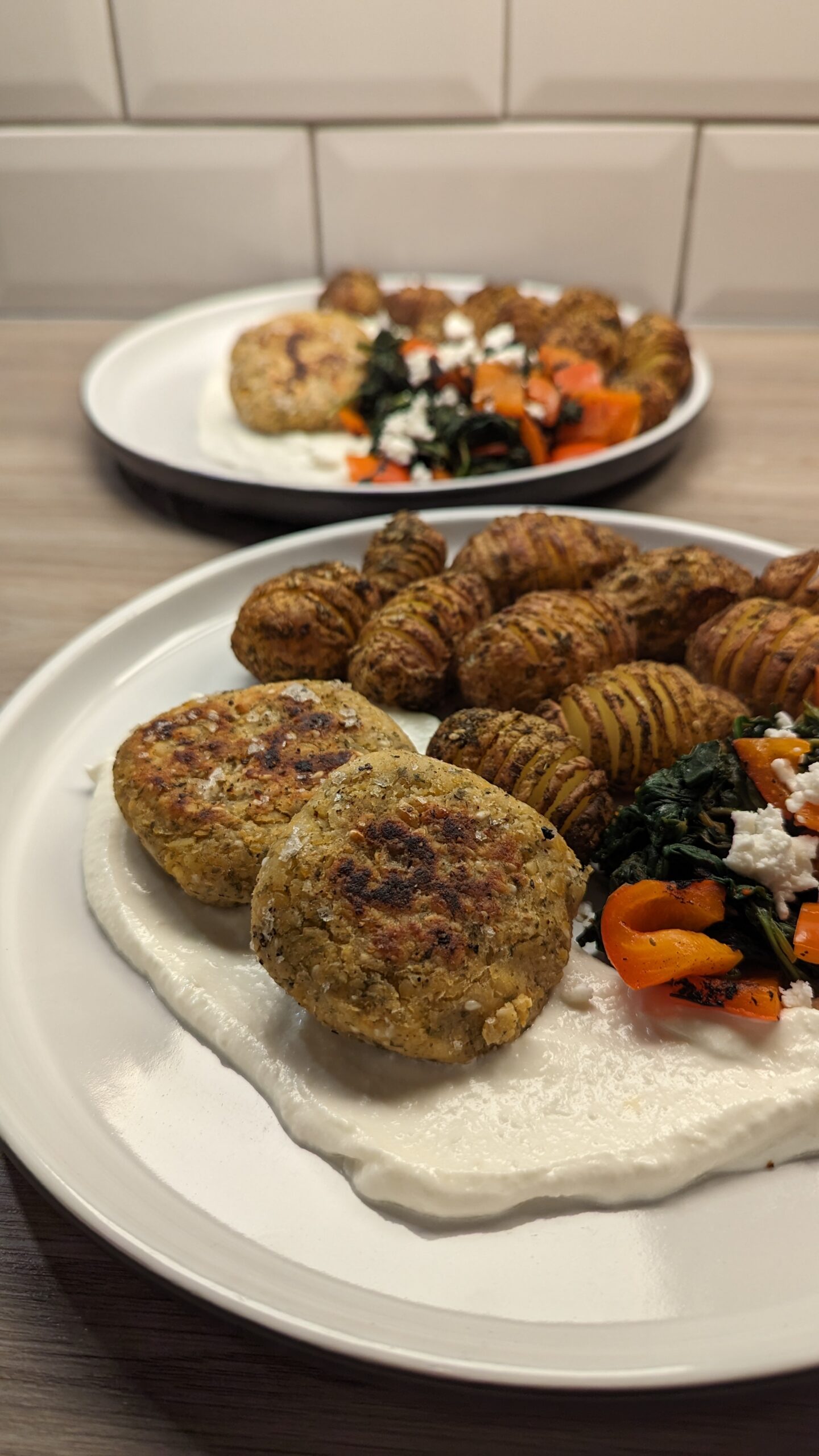 Pan Fried Falafel, Za’atar Hassleback Potatoes and Sauteed Harrisa Spinach with Chargrilled Red Pepper with Whipped Feta