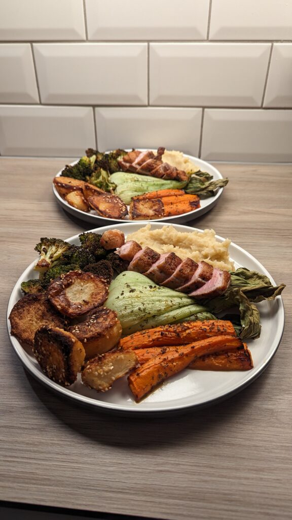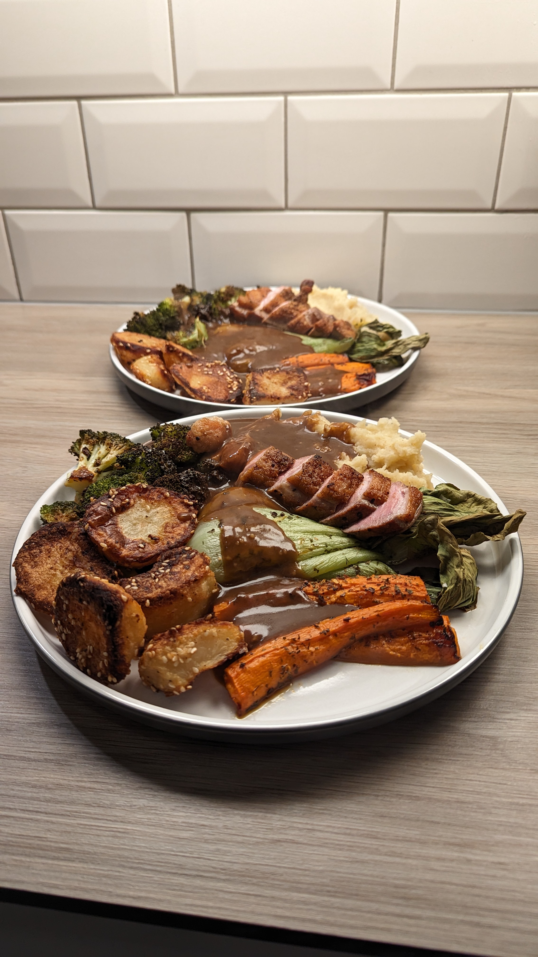 Pan Seared Duck, Lemon and Chilli Carrots, Soy Broccoli, Sesame and Garlic Roast Potatoes, Honey Roasted Bok Choy and Ginger and Honey Mash Potato