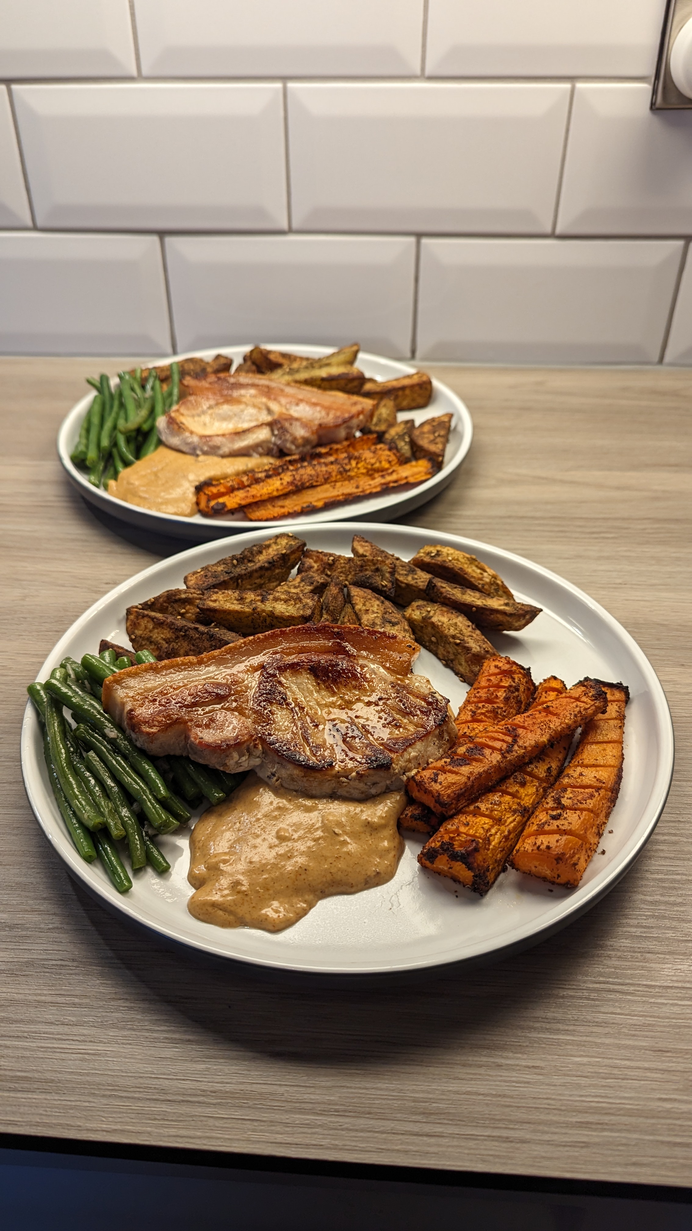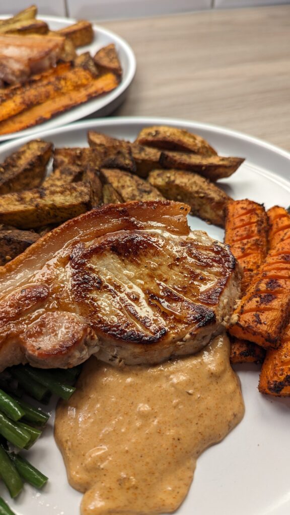 Pan Seared Pork Loin, Za’atar Chips, Sumac Carrots and Garlic Green Beans with a Harrisa and Lime Pan Sauce