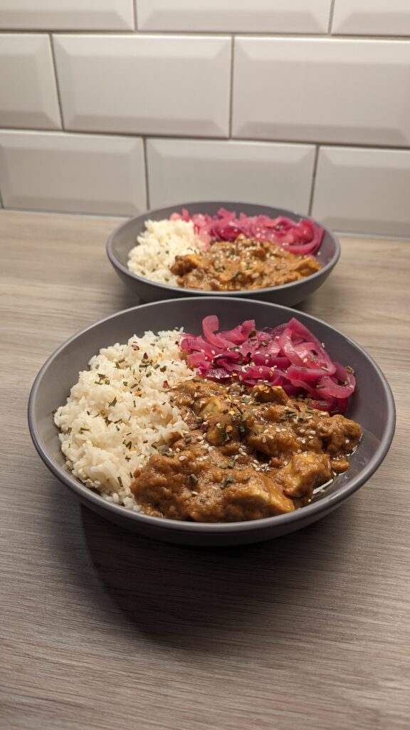 Peanut Tofu, Garlic Rice and Pickled Red Onion