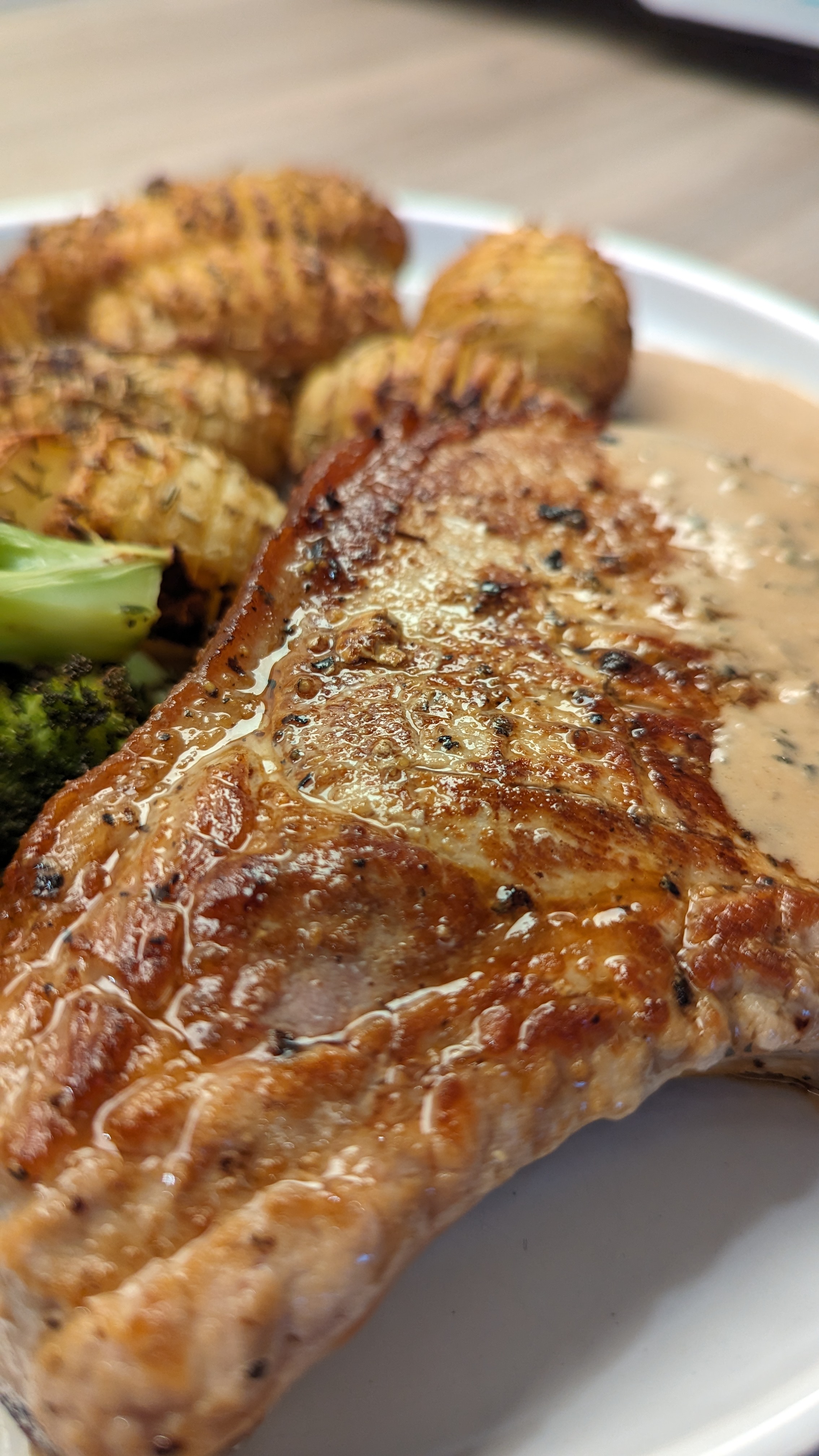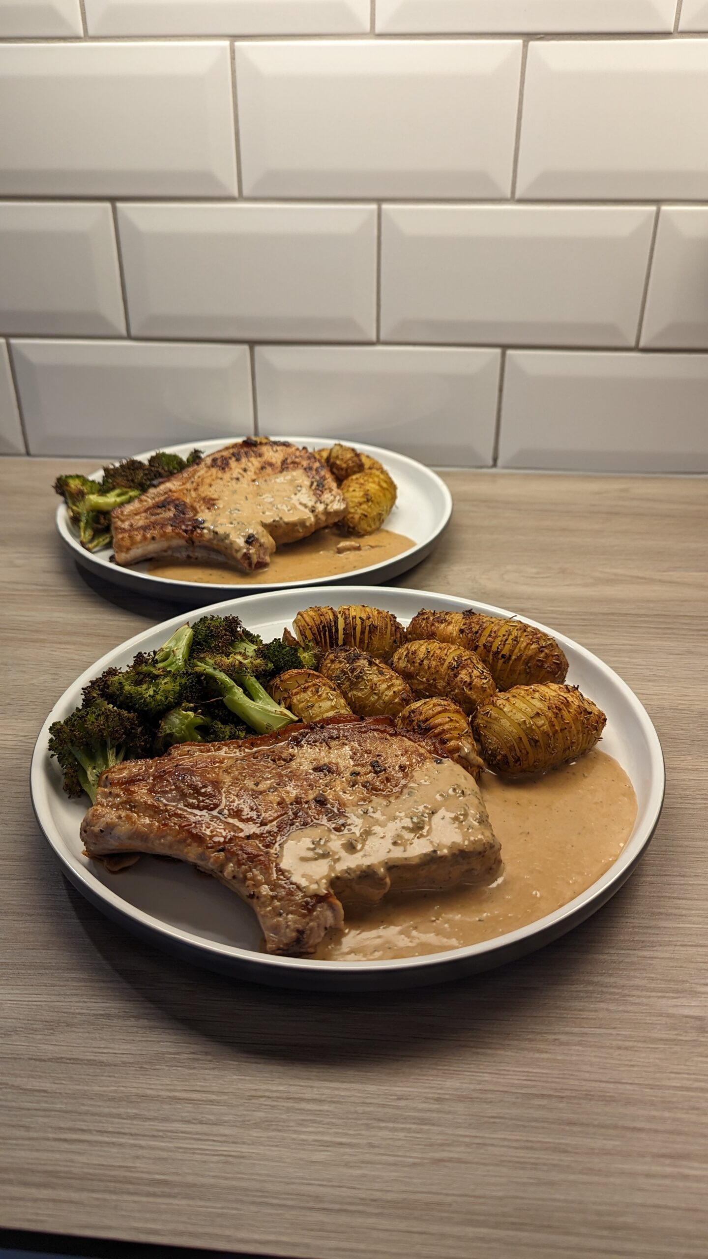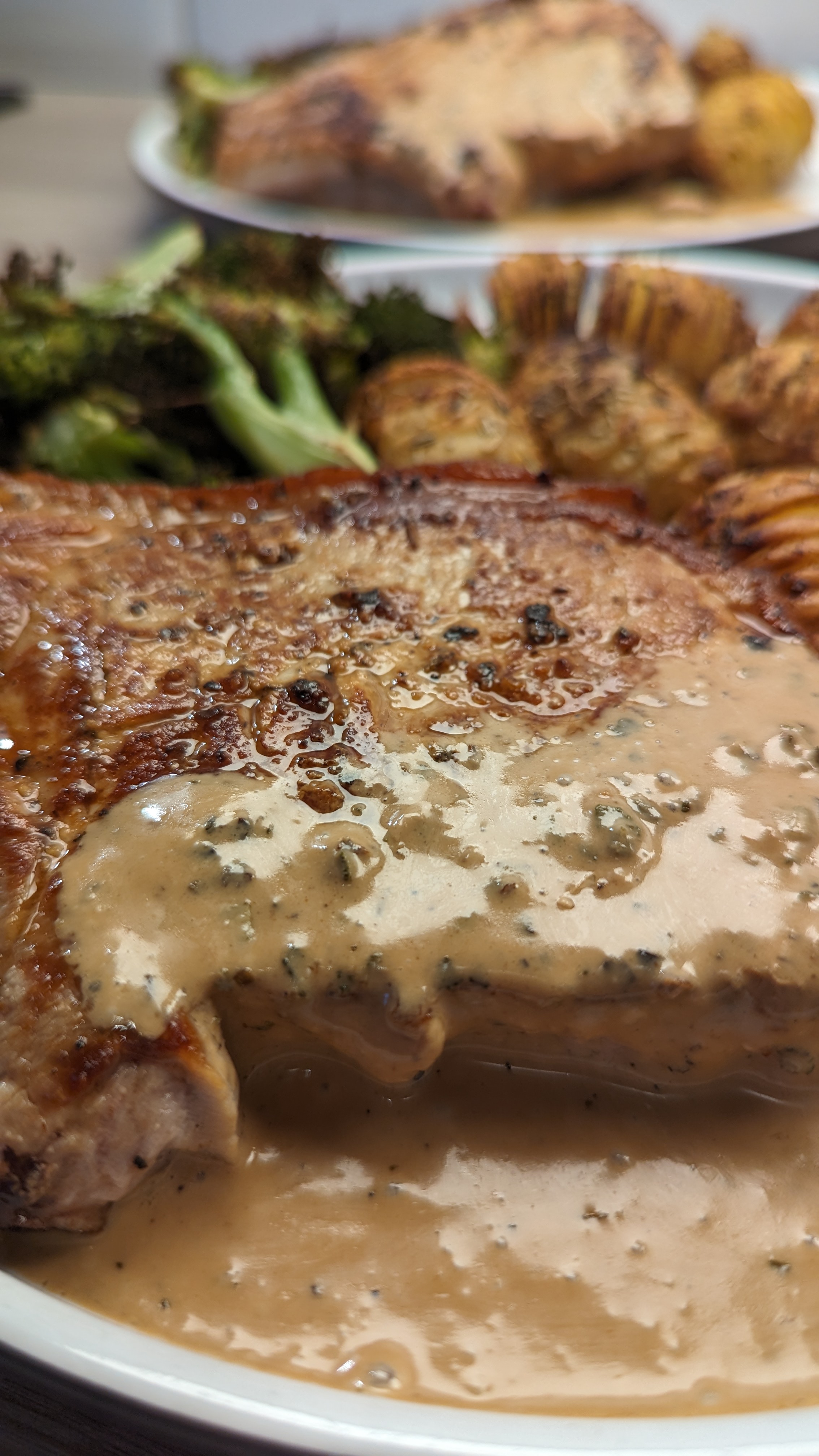 Pork Loin Chops, Garlic and Rosemary Hassleback New Potatoes and Tarragon Broccoli with a Sage and Garlic Pan Sauce