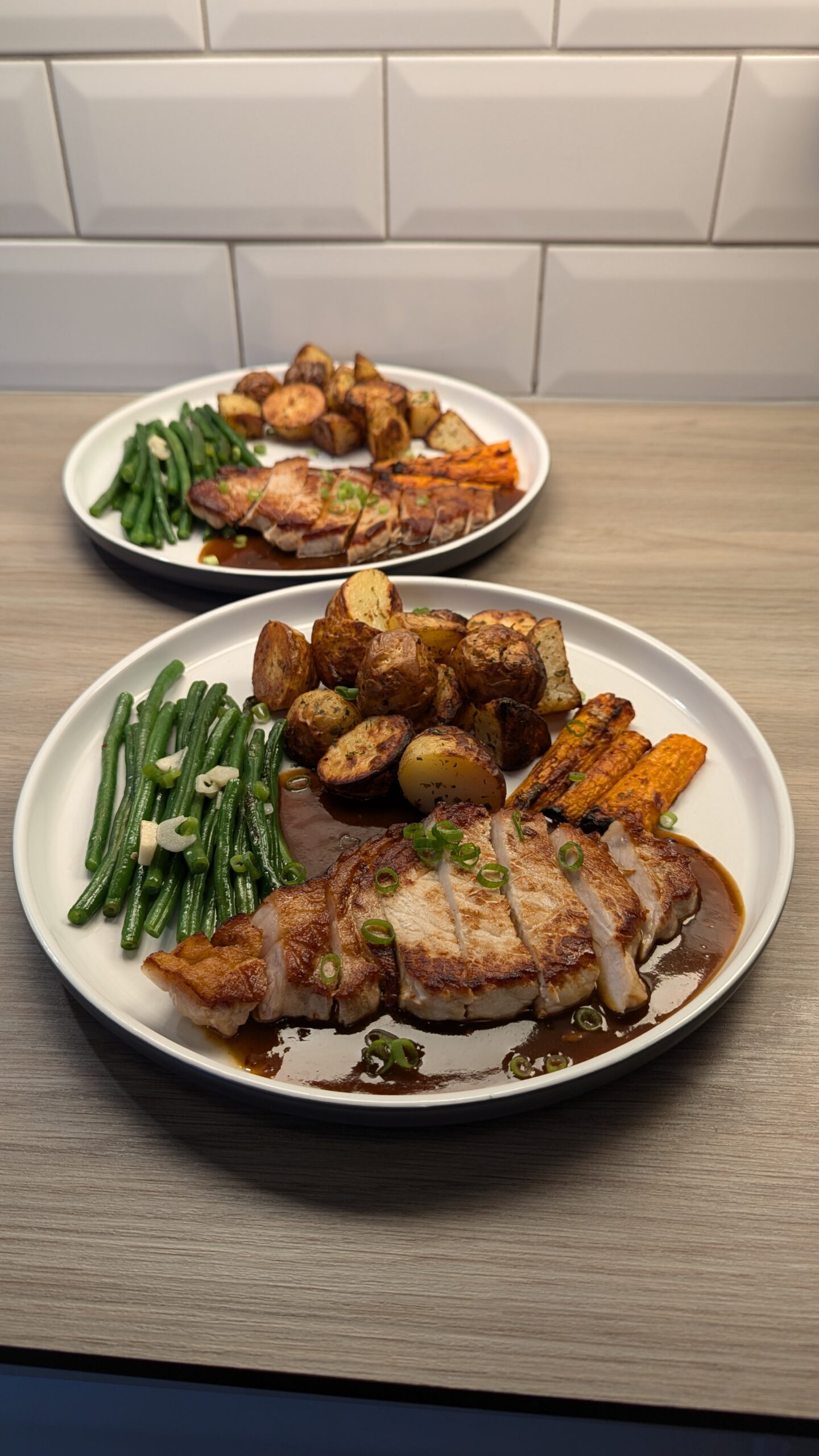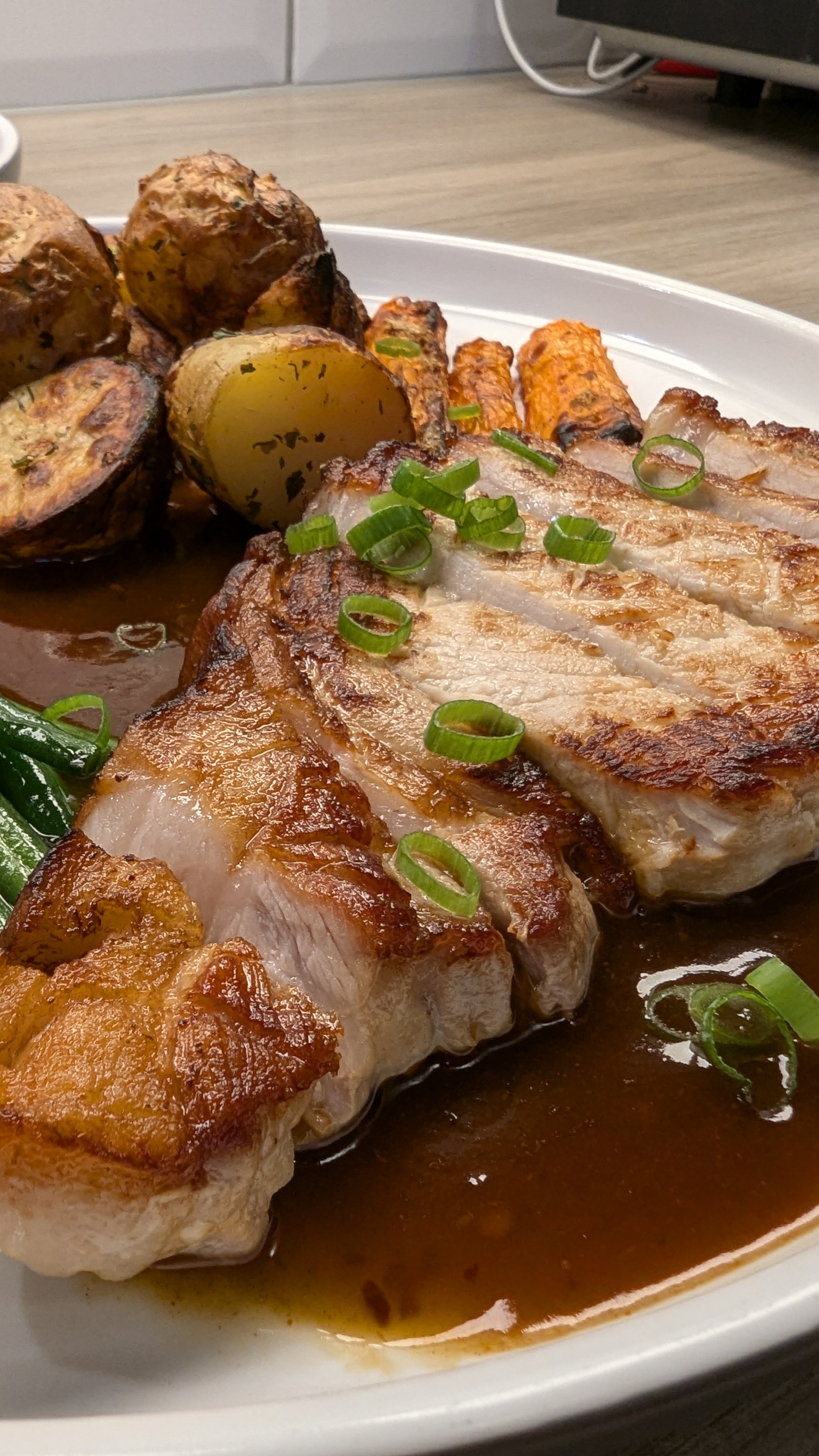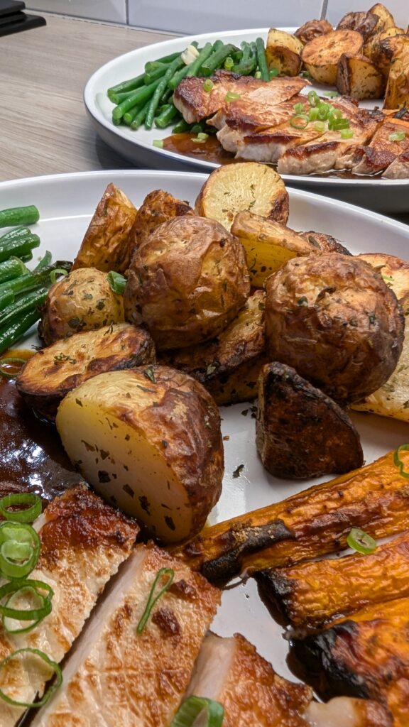 Pork Loin Steak, Garlic and Coriander Potatoes, Garlic Green Beans and Roasted Ginger Carrots with a Sweet Chilli Sauce