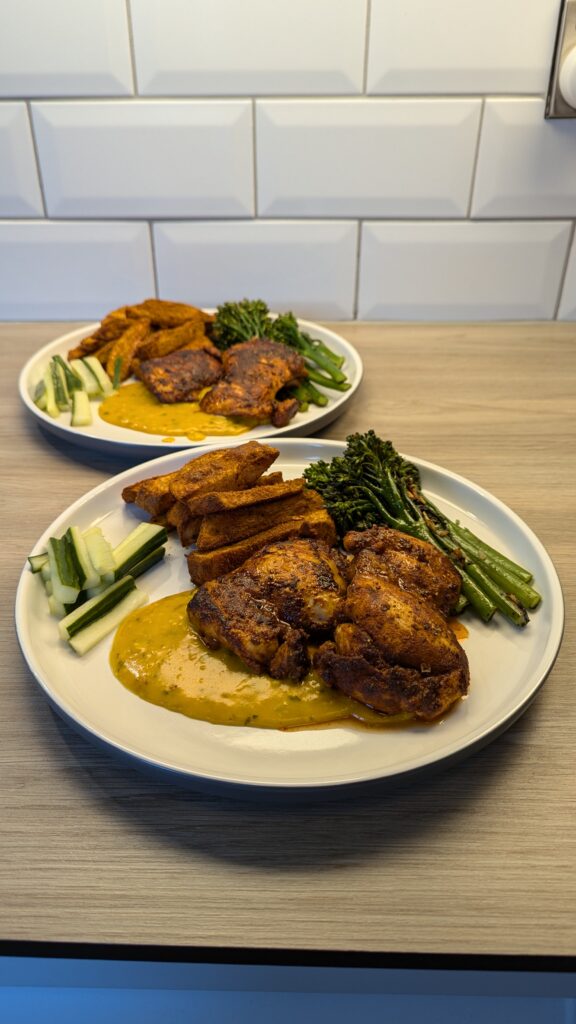 Smokey Paprika Chicken Thighs, Spiced Fries, Garlic Tenderstem Broccoli and Pickled Cucumber with a Spicy Lime Sauce