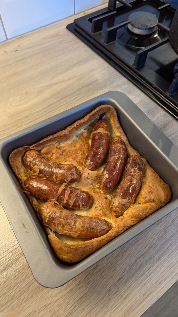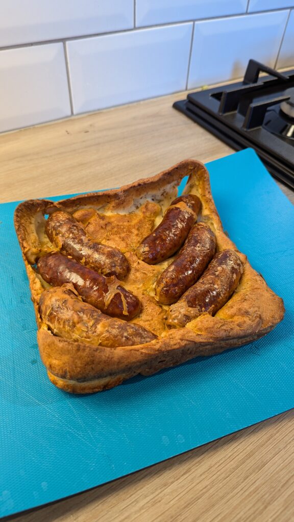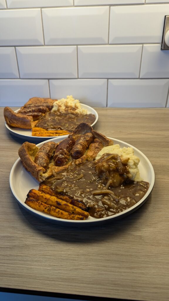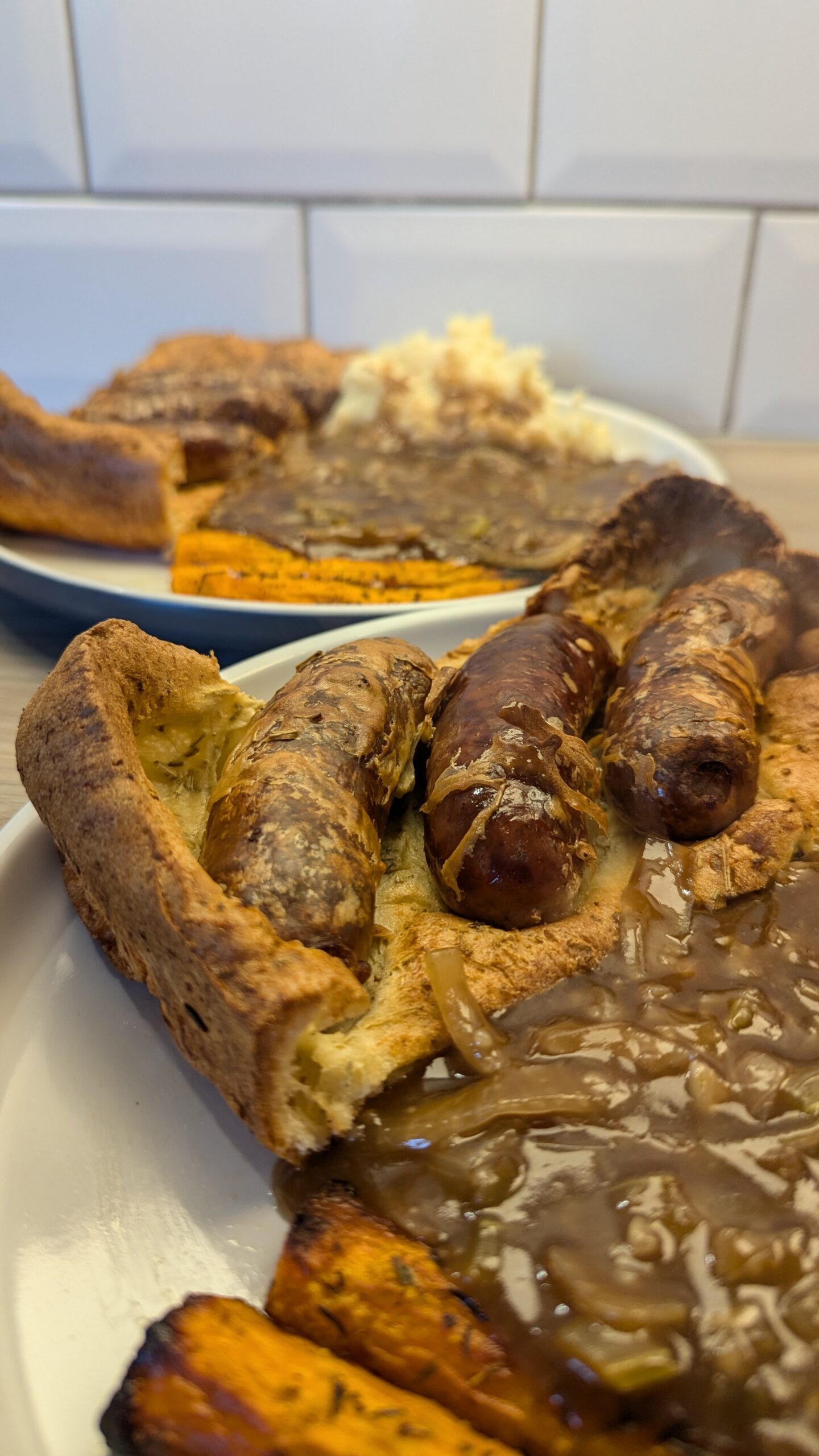 Toad in the Hole, Garlic Mash Potato, Roast Carrots and Onion Gravy