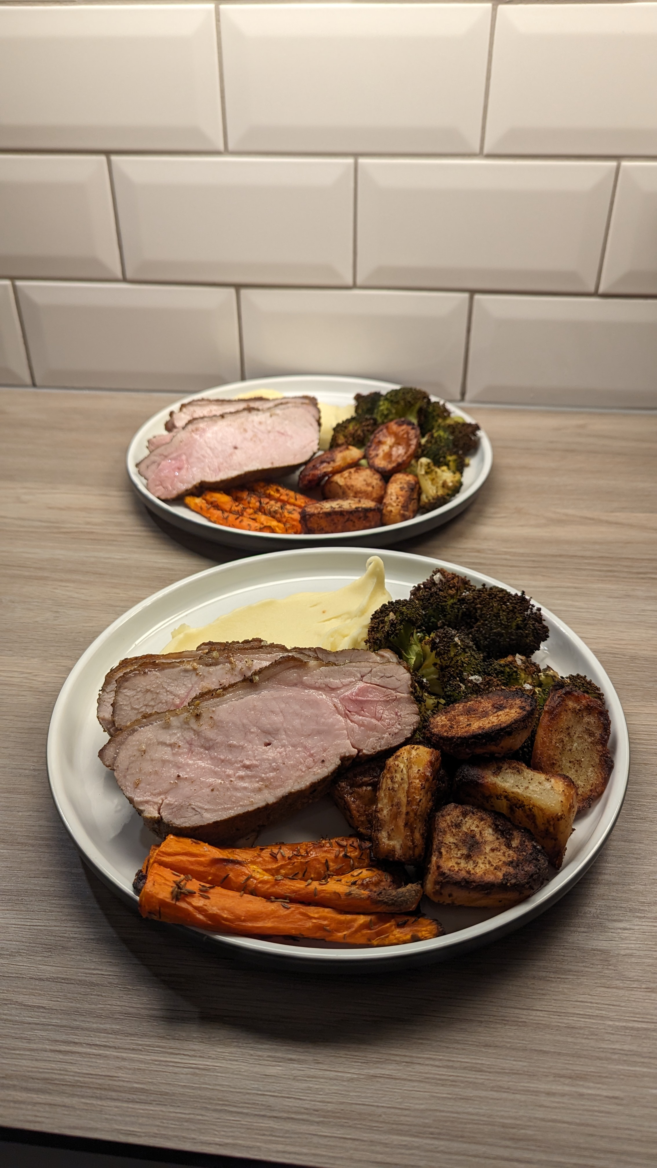 Za’atar Rubbed Pork Loin, Roasted Garlic Pomme Puree, Sumac Roast Potatoes and Roasted Vegetables