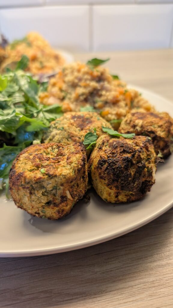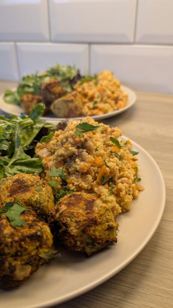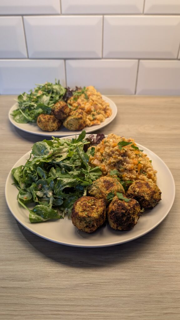 Air Fryer Falafel and Vegetable Cous Cous with a Salad in a Peanut Dressing