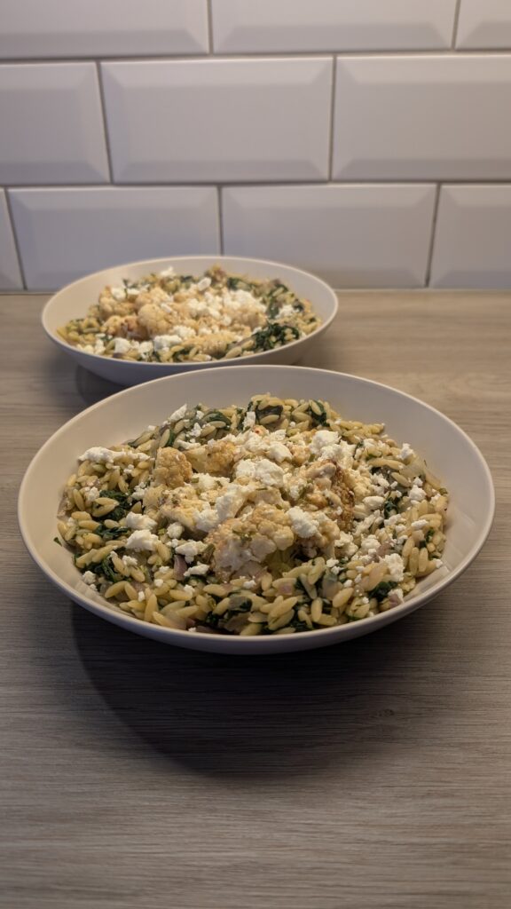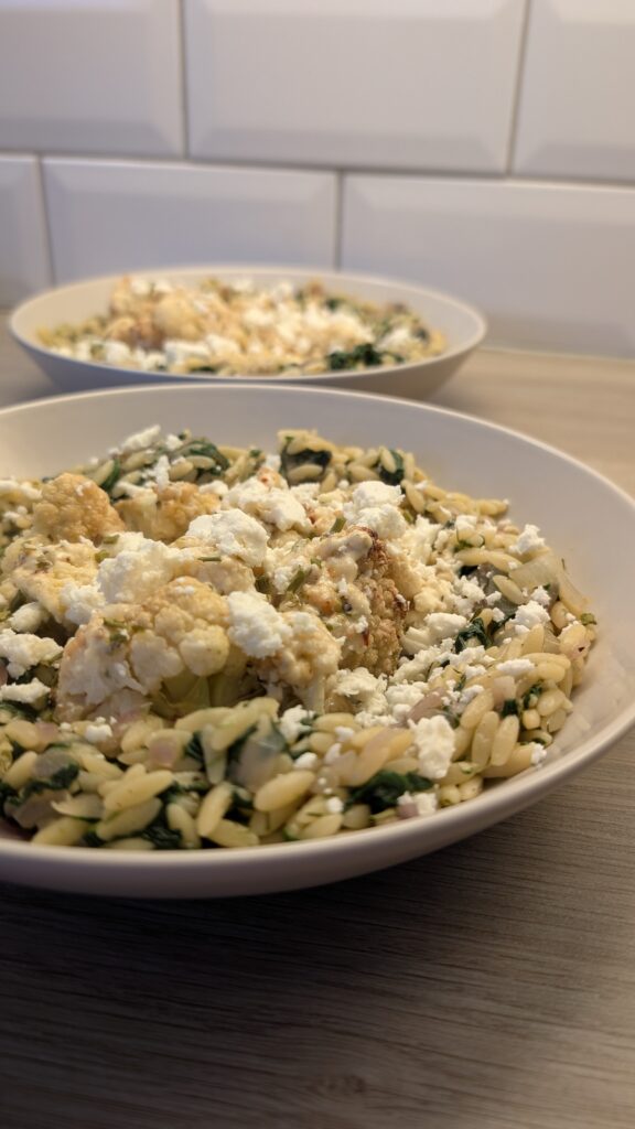 Baked Cauliflower, Feta and Honey with a Spinach and Red Onion Orzo