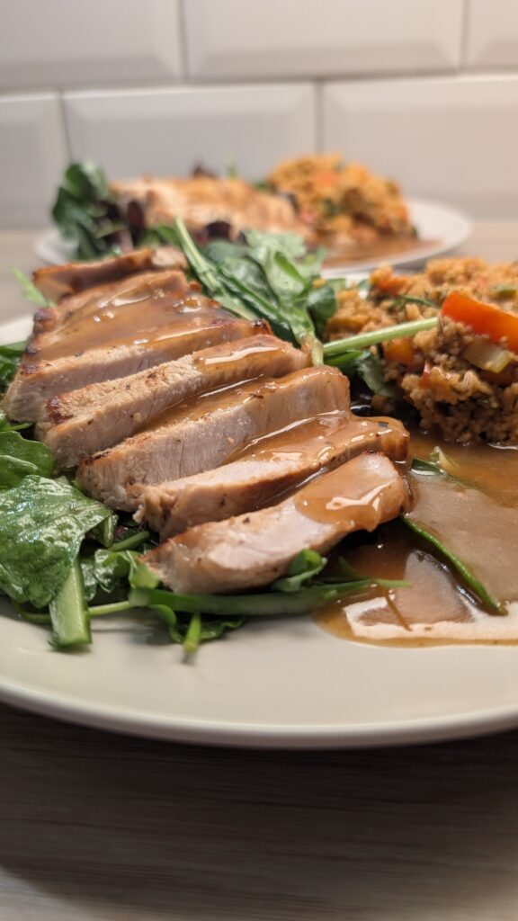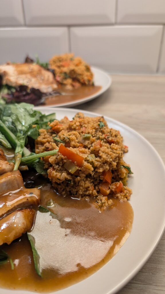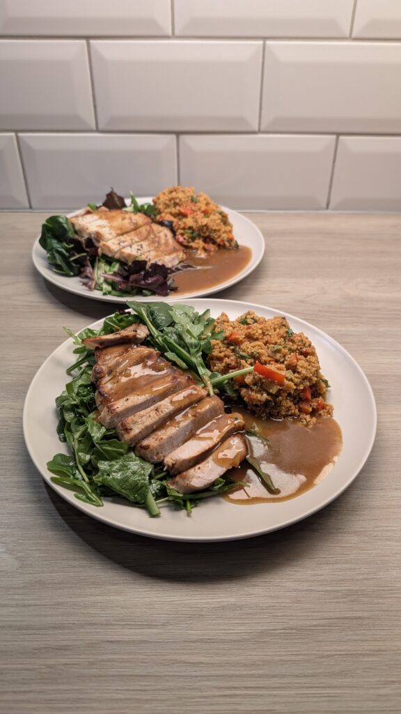 Chilli Marinated Pork Loin, Smokey Red Pepper Cous Cous and a Rocket and Cucumber Salad in a Honey Vinaigrette with a Spicy Chicken Reduction
