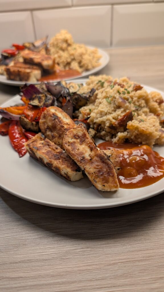 Crispy Halloumi, Roasted Mediterranean Vegetables and Sun-dried Tomato Cous Cous with a Sweet Chilli Jam