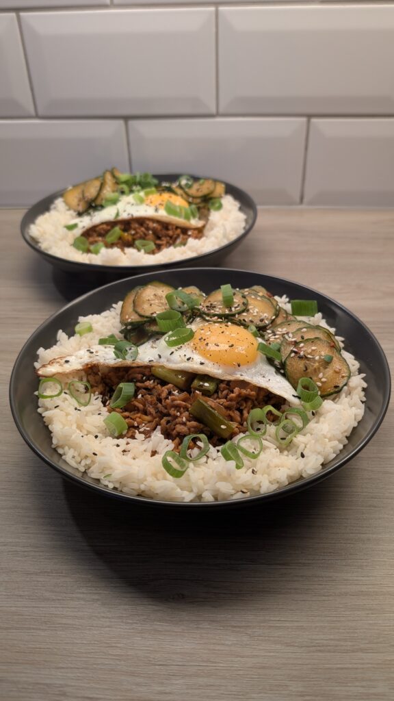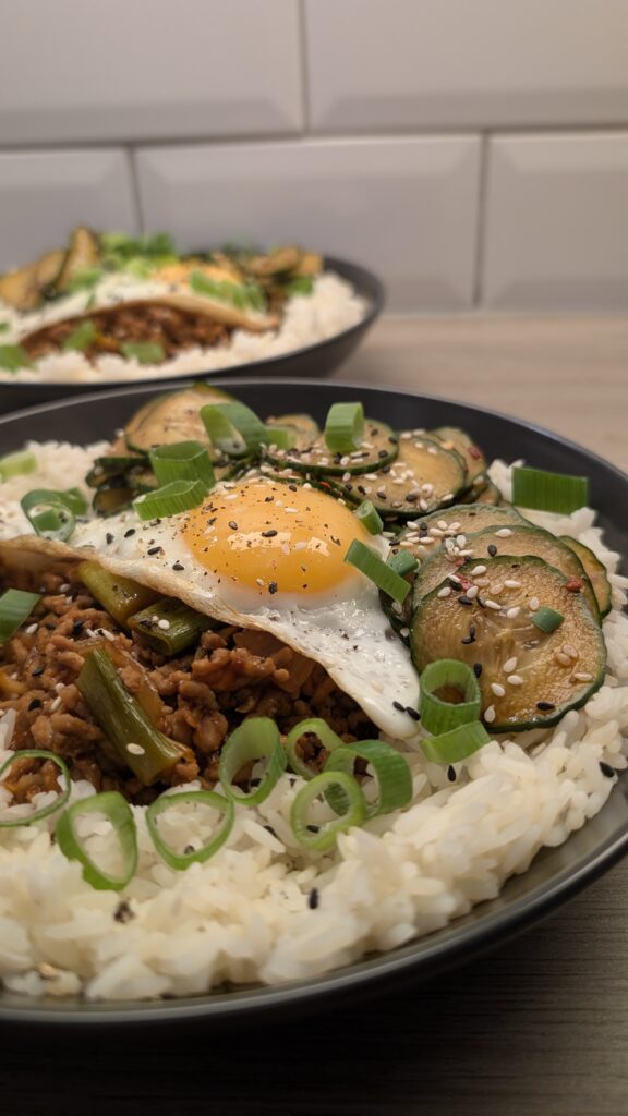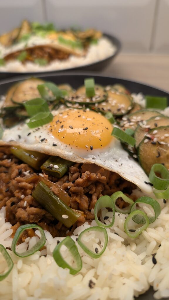 Gochujang Ground Pork, Oi Muchim, Rice and Fried Egg