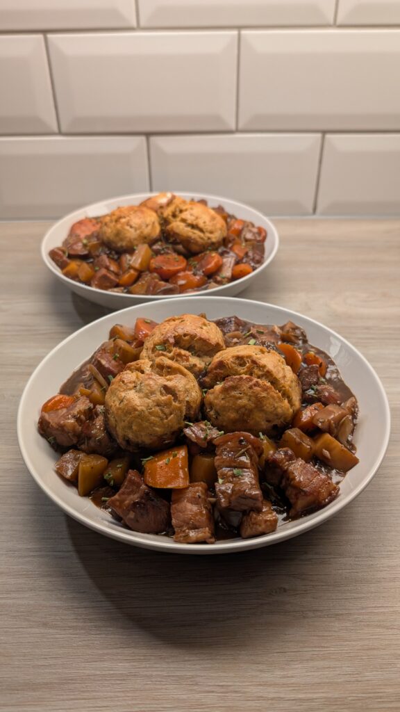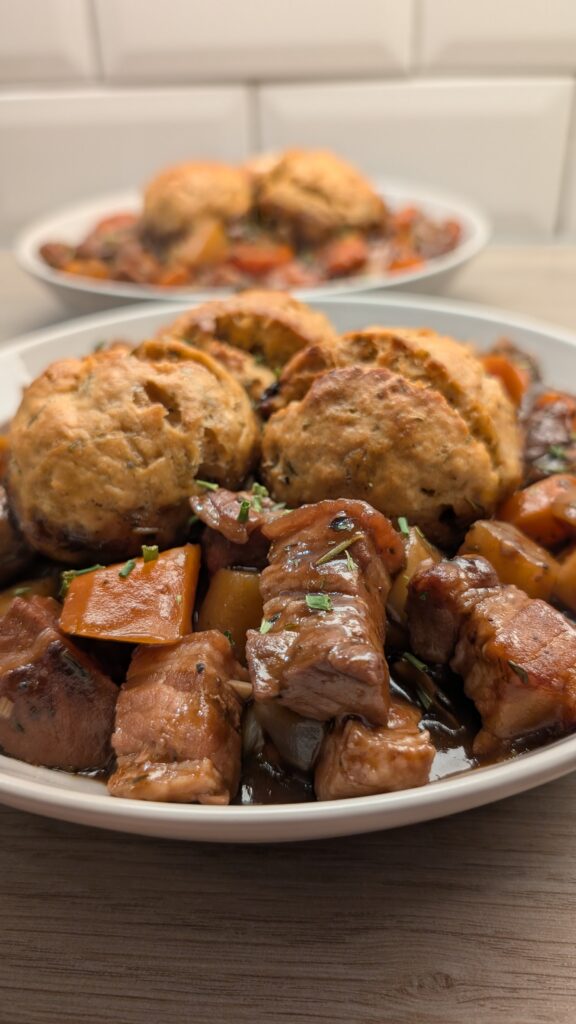 Red Wine Pork Belly Stew with Smokey Apple Dumplings