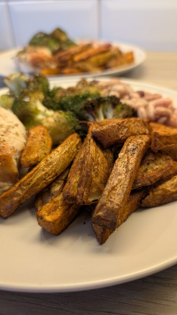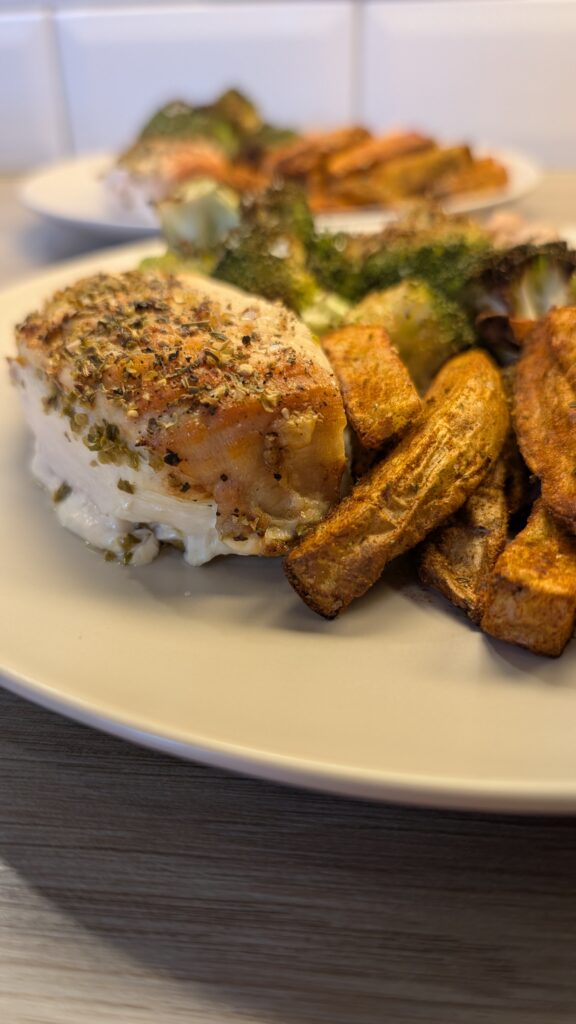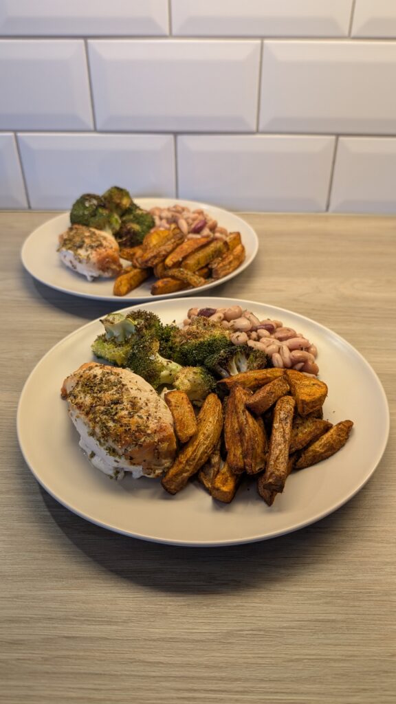Roast Chicken Breast, Smokey Fries, Cumin Broccoli and Bean Salad