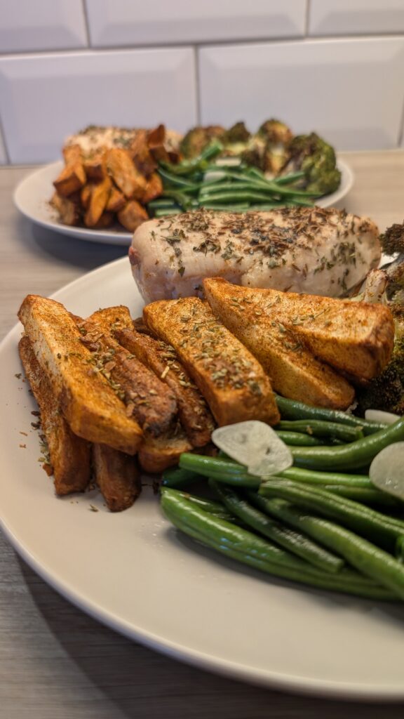 Roast Chicken, Smokey Fries, Garlic Green Beans and Fenugreek Roasted Broccoli