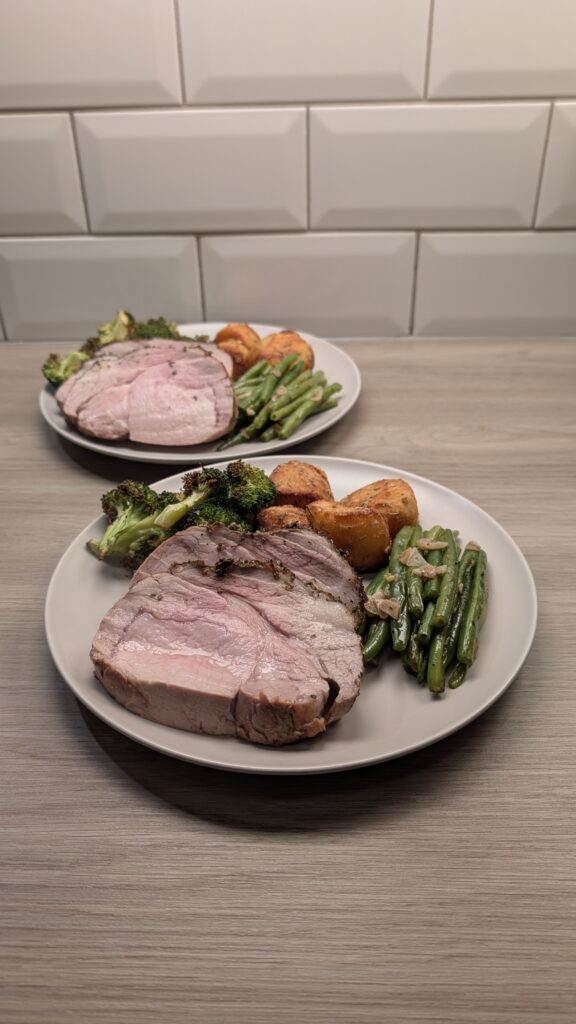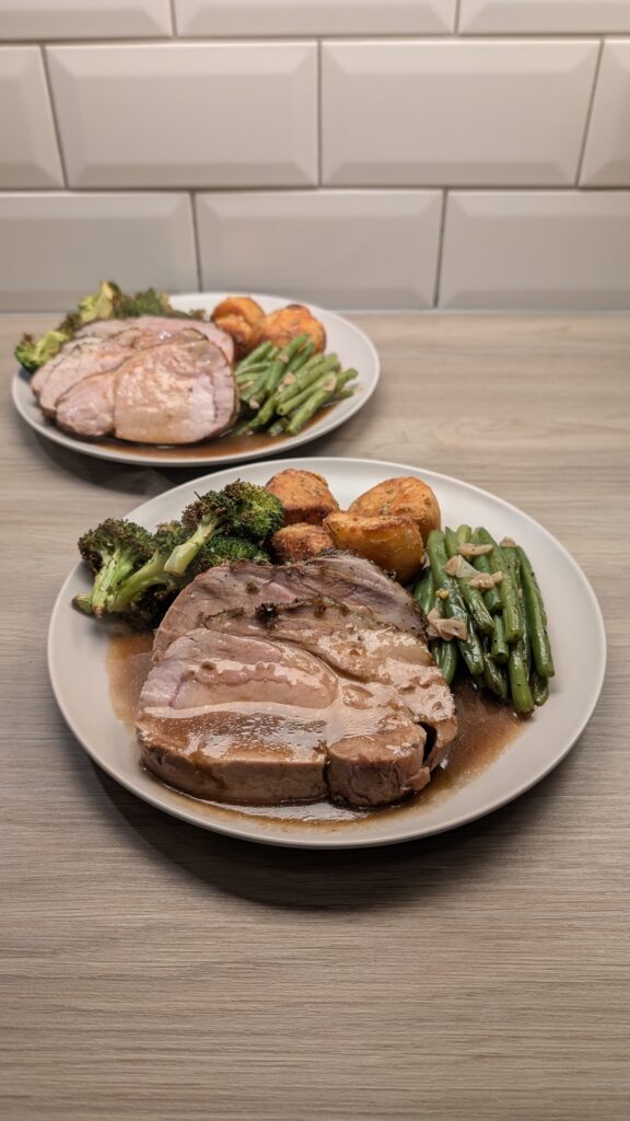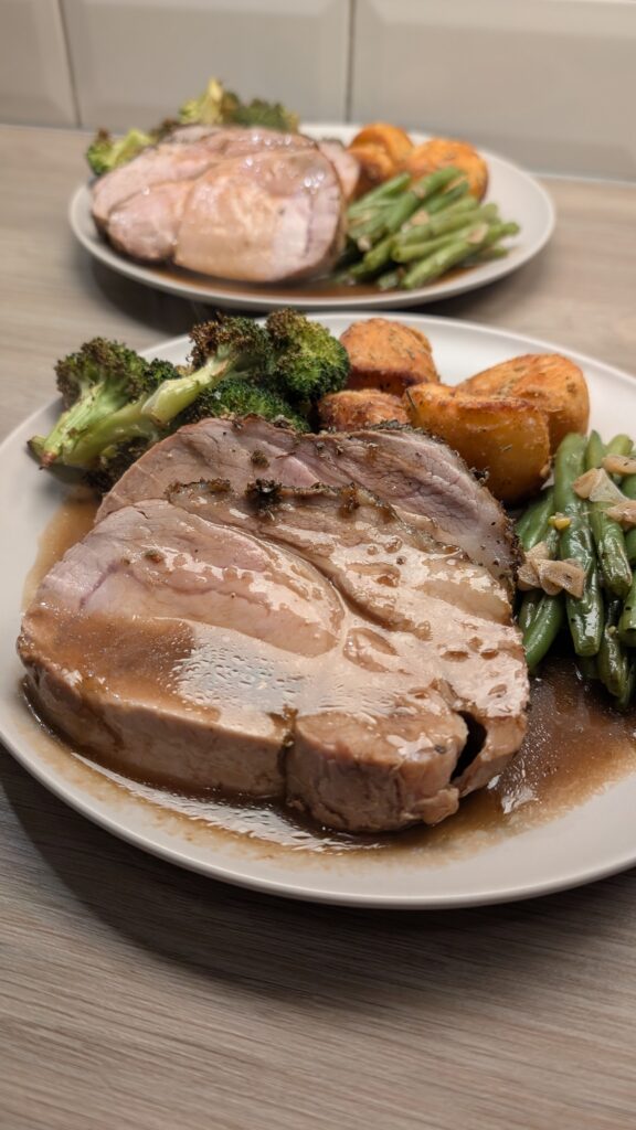 Sage Roast Pork Loin, Garlic and Rosemary Roast Potatoes, Garlic Green Beans and Roasted Broccoli with a Mustard Gravy
