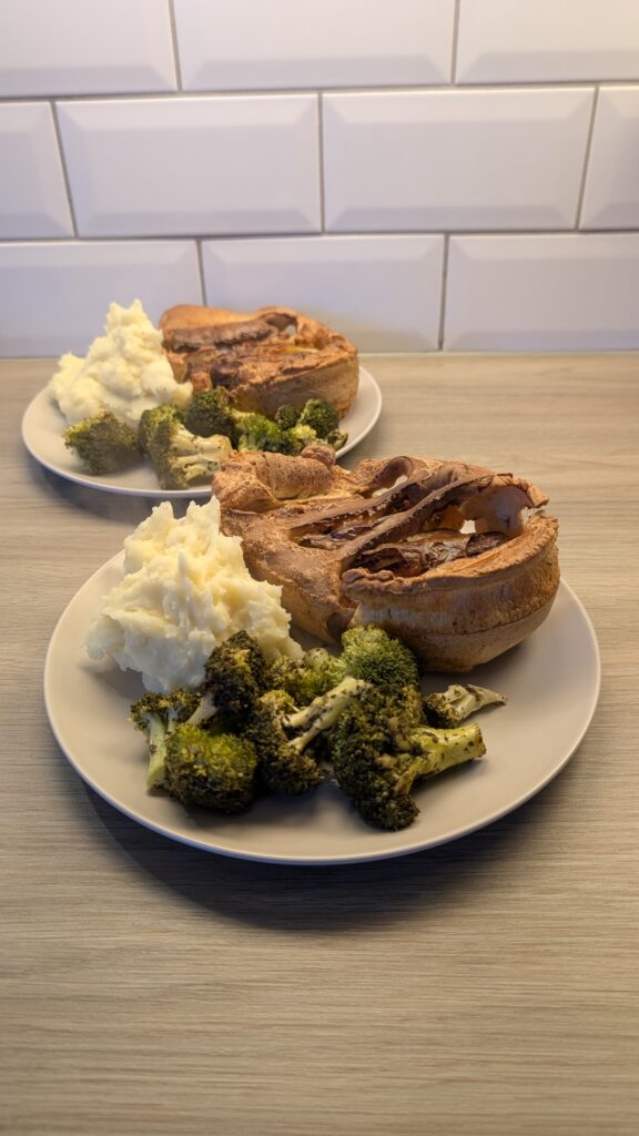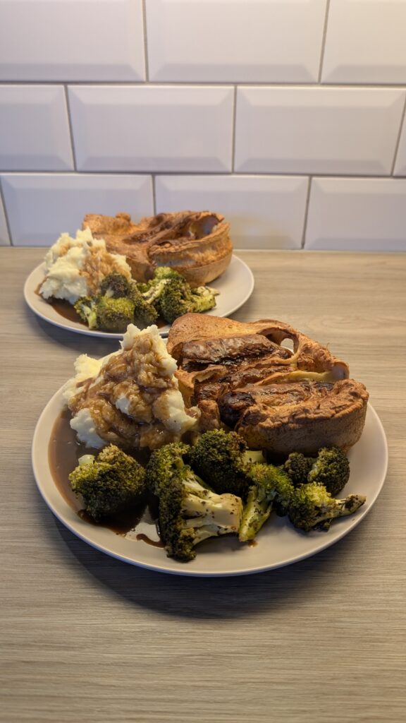 Toad in the Hole, Garlic Mash Potato and Minted Broccoli with a Balsamic Gravy
