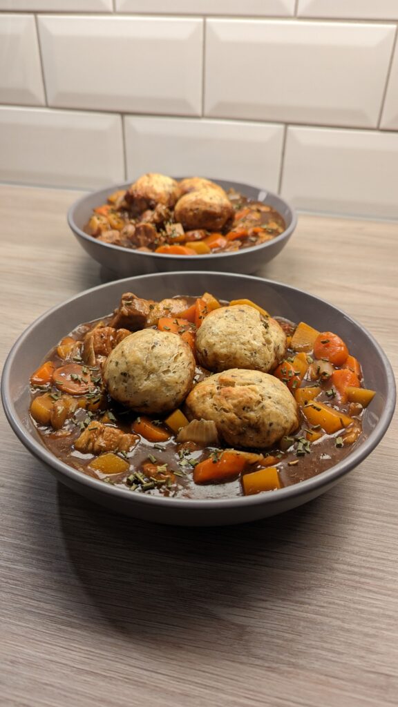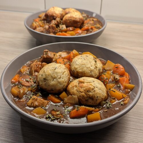 A rich red wine pork belly stew. Serve with dumplings or Yorkshire Puddings.